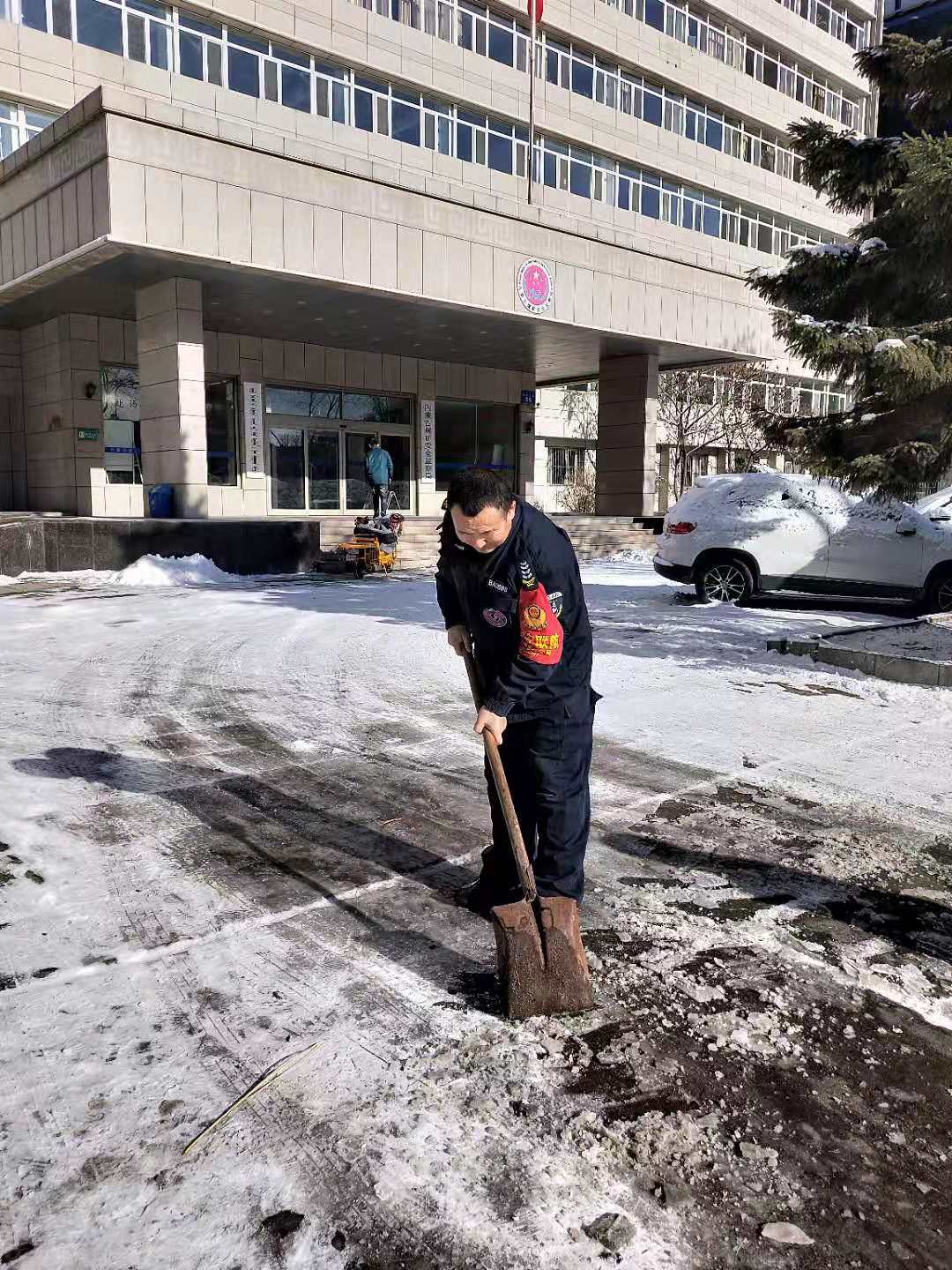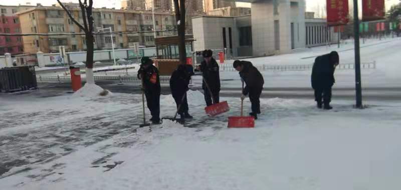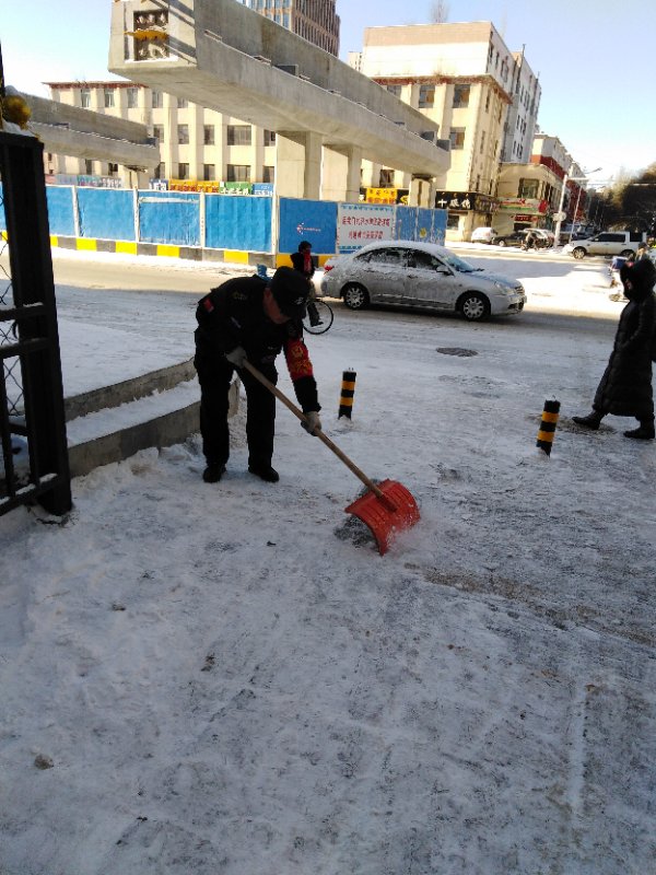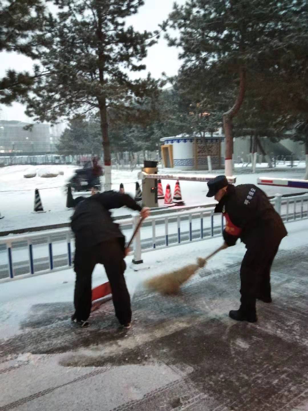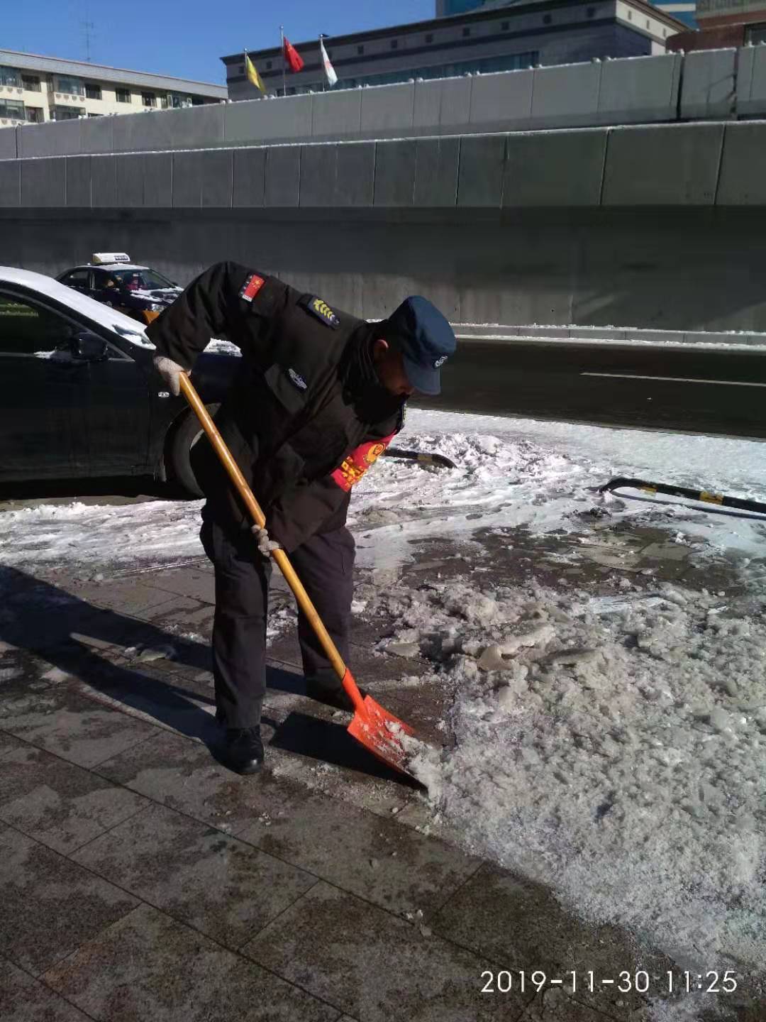 2019年入冬以來第一場(chǎng)雪飄灑而至,厚厚的積雪為出行帶來了諸多不便,為方便客戶單位人員出行,呼和浩特市保安服務(wù)公司駐勤各中隊(duì)、班組紛紛發(fā)動(dòng)保安員冒著風(fēng)雪和嚴(yán)寒,揮舞鐵鍬、掃把、各種鏟雪、除雪工具,一起清掃駐勤單位的積雪堅(jiān)冰。